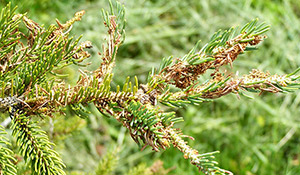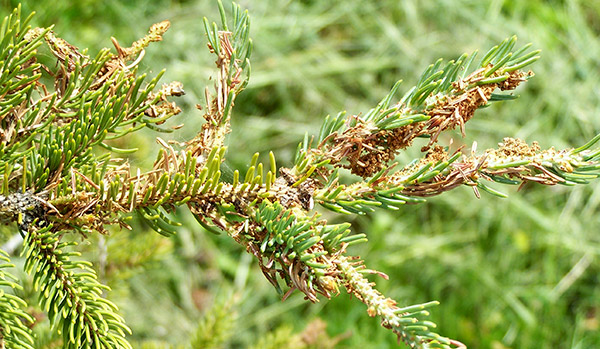 Spruce budworm is the most destructive, native defoliating insect in eastern Canada. When budworm populations reach outbreak levels, significant ecological and economic damage occurs (see www.healthyforestpartnership.ca for more details). In New Brunswick, budworm populations are tracked through numerous surveys annually. In the fall, the budworm hatch from eggs, crawl to a secure location on the branches of trees and spin a small web to protect them from the winter elements. They will stay in this location, dormant, throughout the winter and into the spring of the following year before emerging to feed on the new needles of spruce and fir branches.