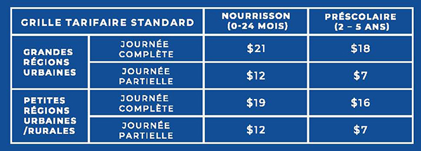 Les frais payés par les parents ayant des enfants âgés de 0 à 5 ans, et qui sont inscrits dans un centre désigné sont maintenant réduits en moyenne de 50 % en date du 1er juin 2022. Le ministère de l’Éducation et du Développement de la petite enfance applique une Grille standardisée de frais aux parents qui fixe les frais pouvant être exigés des parents par les centres désignés. Voir les nouveaux taux quotidiens ci-dessous: