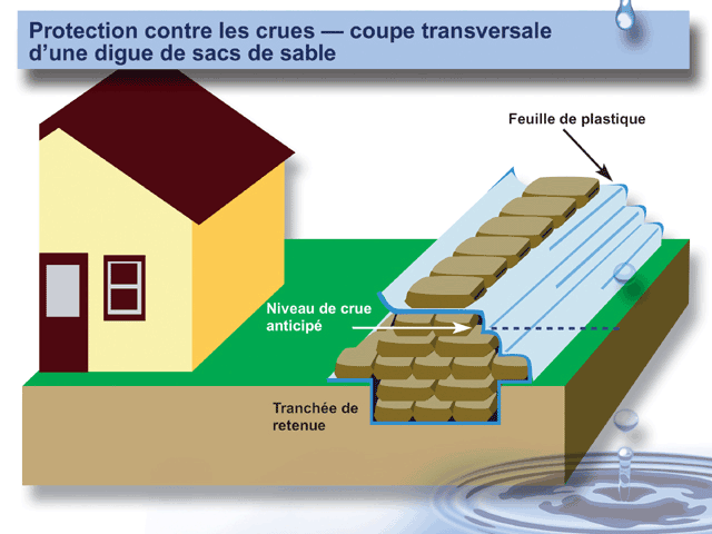 Adapté de « Protection contre les inondations : protégez votre maison contre les inondations ». Environnement Canada et ministère des Affaires municipales et de l'Environnement du Nouveau-Brunswick, 1989.